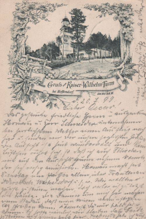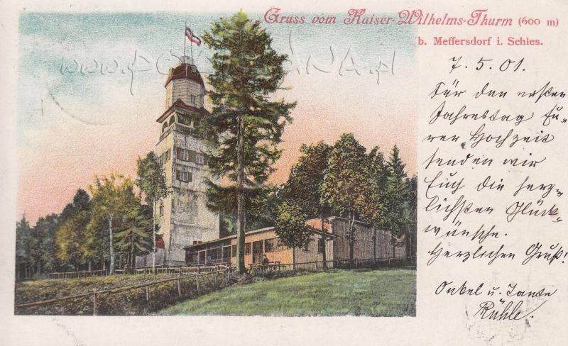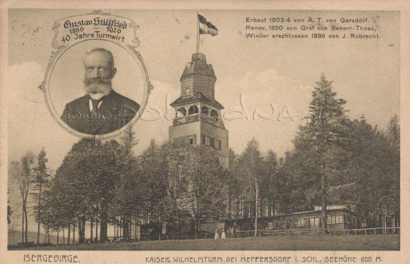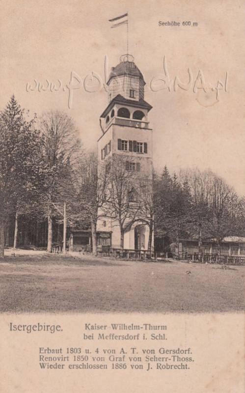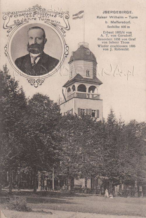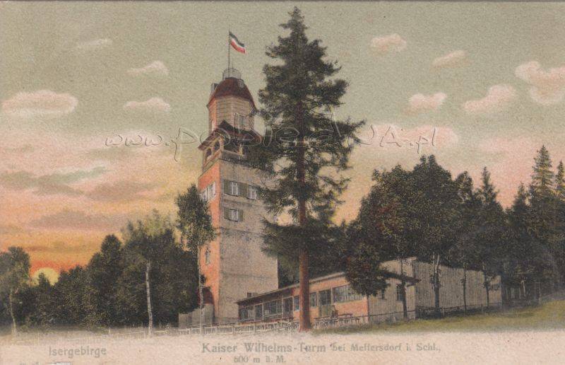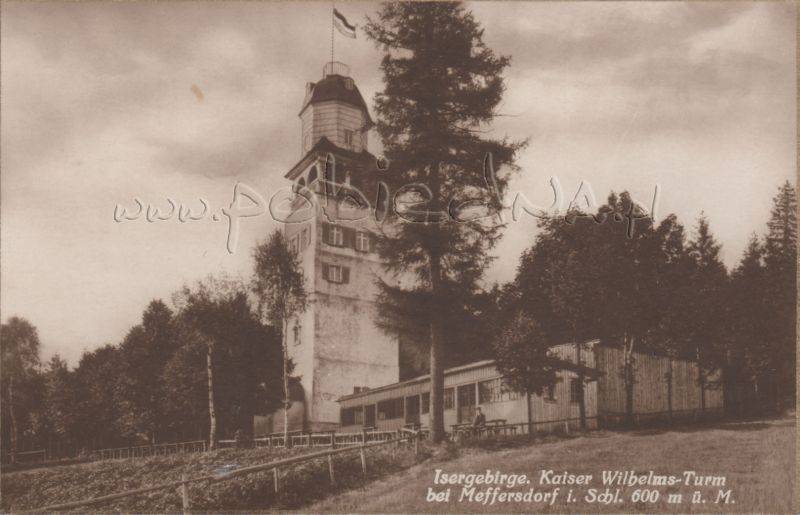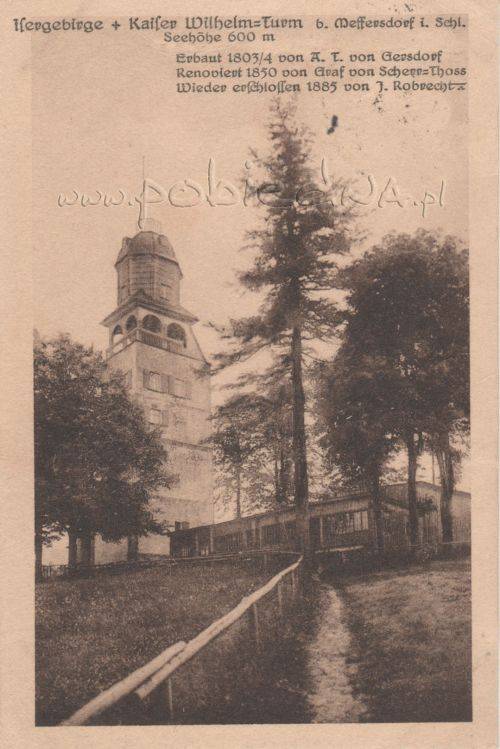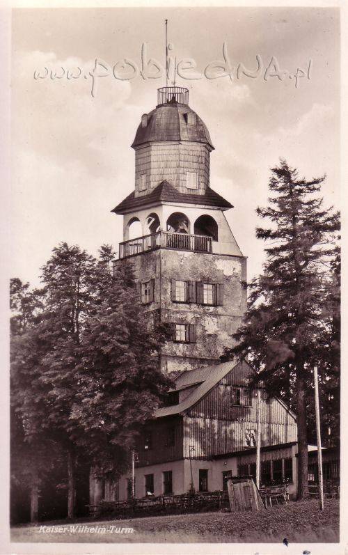 Budynek powstał w latach 1803-1804 z inicjatywy ówczesnego właściciela Pobiednej, Adolfa Traugotta von Gersdorfa. Był on człowiekiem bardzo wyksztalconym i dobrze traktującym swoich poddanych. Jedną z jego pasji była astronomia. Gdy choroba uniemożliwiła mu chodzenie po górach, postanowił wybudować wieżę, z której mógłby obserwować niebo i gwiazdy. Do budowy zatrudnił swoich poddanych, umożliwiając im tym samym zarabianie w czasach biedy. Gersdorf spędzał w wieży mnóstwo czasu i nazywał ją Mon Plaisir (Moja Przyjemność). W roku 1850 wieża została odrestaurowana i udostępniona turystom. Od 1886 roku budowla nosiła imię Cesarza Wilhelma (w roku 2010 powrócono do dawnej nazwy). Z biegiem lat przy wieży powstała restauracja oraz miejsca noclegowe. Po II wojnie światowej obiekt stopniowo zmieniał się w ruinę. Dzisiaj z pięknego obserwatorium i gospody zostały tylko fragmenty murów. Warto dodać, że gmina czyni starania o odrestaurowanie obiektu i ponowne udostępnienie turystom jako wieżę widokową.