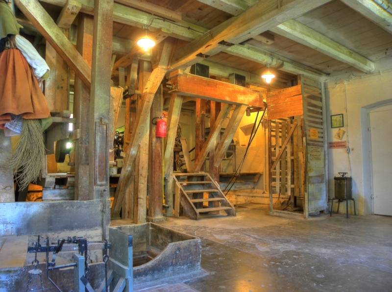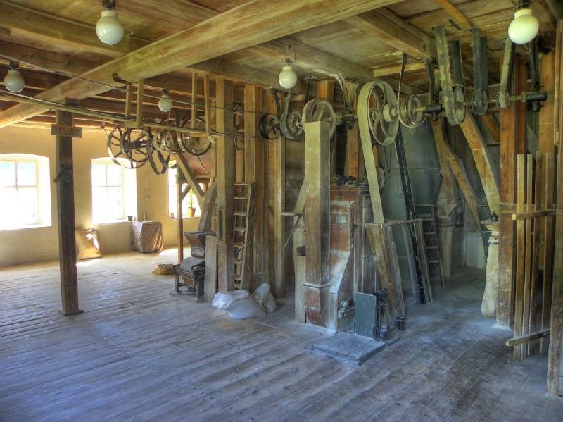 W Sali historycznej mieszczą się urządzenia technologiczne pierwszego poziomu. Do ok. 1951 roku młyn dysponował napędem z koła wodnego, nasiębiernego, którego obroty napędzały wał, a ten wprawiał w ruch pędnie pasowe na poszczególne maszyny i urządzenia młyńskie. Niestety w 1951 roku uszkodzeniu uległa oś koła i w efekcie wstrzymano pracę na kilka lat. W 1957 roku wiosenna powódź uszkodziła również jaz piętrzący na Czarnym Potoku i stawidła mechaniczne. W 1957 roku Piotr Pietrasz podjął się próby uruchomienia młyna i zastosował napęd poniemieckiego silnika elektrycznego.