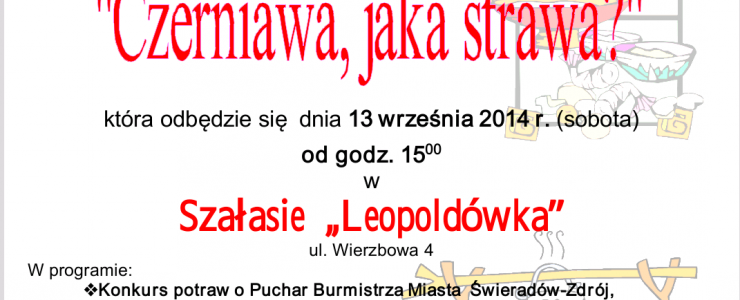 W programie: Konkurs potraw o Puchar Burmistrza Miasta Świeradów-Zdrój, Degustacja potraw konkursowych, Przyznanie Certyfikatów Potrawy Lokalnej „ Świeradowski Smakołyk”, Wystąpienie klasyfikatora grzybów z Sanepidu w Lubaniu, Pokaz kulinarny w profesjonalnym wykonaniu szefa kuchni Szymona Przystupy, Konkurs na najbardziej okazałego grzyba „Grzyb 2014 roku”, Rozstrzygnięcie konkursu fotograficznego „Uroki Czerniawy”, Biesiada z udziałem zespołu folklorystycznego „ Łużyczanki”, Występ laureata I Festiwalu Zespołów Ludowych i Folklorystycznych FOLKFEST, Zabawa ludowa – przy muzyce zespołu „Familia”, Zapraszamy do udziału w konkursach zapisy do 10.09.2014 r. prowadzi Małgorzata Gettner tel. (75)7816379 oraz 501 312 323 "ZREALIZOWANO ZE ŚRODKÓW BURMISTRZA MIASTA ŚWIERADÓW-ZDÓJ"
