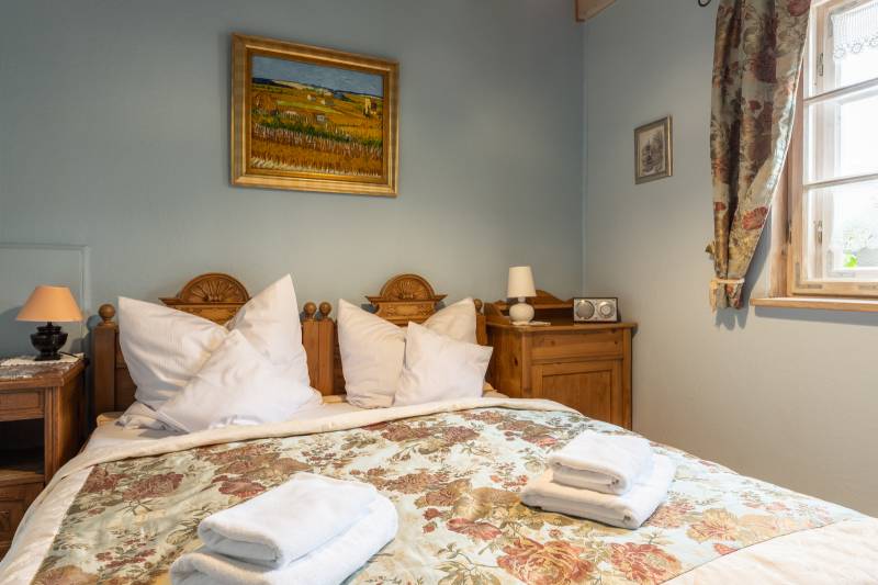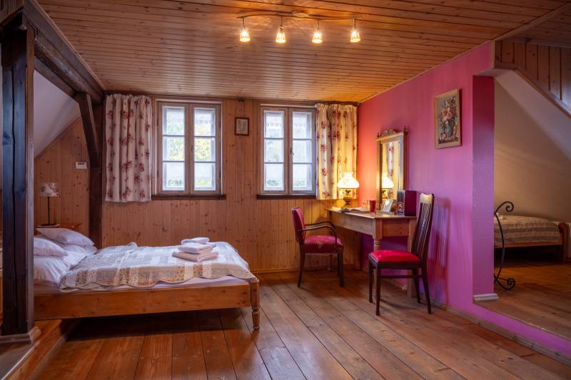 Do dyspozycji gości oddajemy 3 apartamenty, każdy z łazienką, a także kompletnie wyposażoną wspólną kuchnię z miejscem do biesiadowania przy kominku. To idealne miejsce dla trzech par, trzech rodzin z dziećmi lub grupy przyjaciół pragnących wypocząć w mniejszym gronie.
