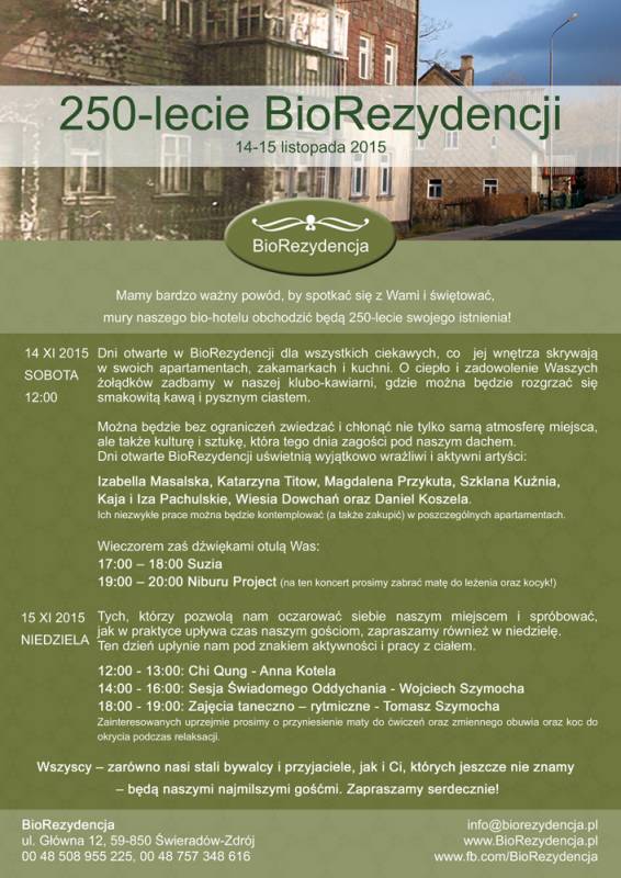 14 i 15 listopada 2015 – to będą wyjątkowe, jesienne dni, wypełnione aromatycznymi zapachami, kojącymi dźwiękami i mnóstwem artystycznych inspiracji we wnętrzach magicznej BioRezydencji!