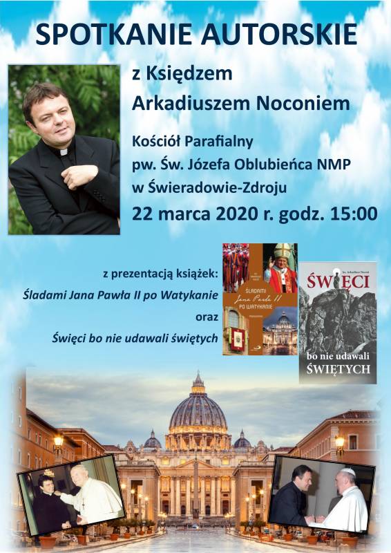 Zapraszamy na spotkanie autorskie z ks. Arkadiuszem Noconiem, które odbędzie się 22 marca 2020 r. o godz. 15:00 w Kościele pw. Św. Józefa Oblubieńca NMP w Świeradowie-Zdroju.