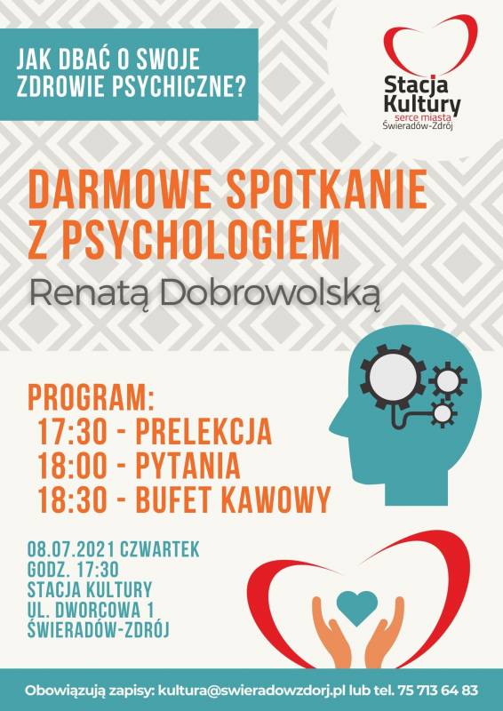 W trakcie prelekcji opowie nam, jak dbać o swoje zdrowie psychiczne oraz odpowie na nurtujące nas pytania. Po części oficjalnej zapraszamy na spotkanie przy kawie i ciastku.