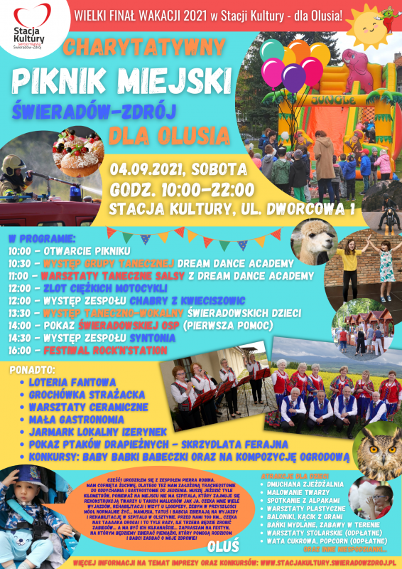 Wielki Finał Wakacji 2021 w Stacji Kultury dedykujemy Olusiowi - chłopcu ze Świeradowa-Zdroju, który urodził się z zespołem Pierra Robina. Olusia czeka wiele wyjazdów, rehabilitacji i wizyt u logopedy, żeby w przyszłości mógł normalnie żyć... Wspólnymi siłami będziemy zbierać pieniążki, które pomogą Rodzinie Olusia sfinansować leczenie. Zapraszamy na Charytatywny Piknik Miejski - 4.09.2021 od godziny 10:00, w trakcie którego będzie można wspomóc ten szczytny cel.