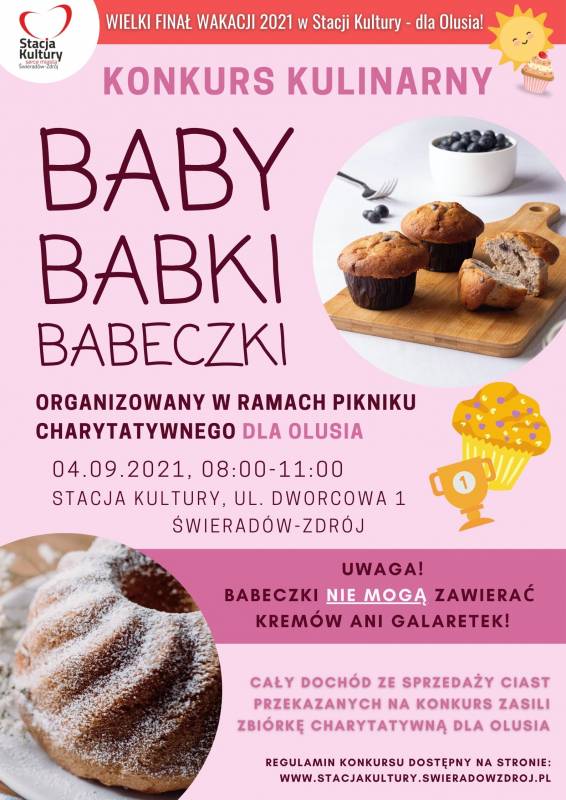 Zapraszamy wszystkich chętnych do przygotowania konkursowego ciasta, które weźmie udział w konkursie na najsmaczniejsza babę, babkę lub babeczkę. Pieniądze z pokonkursowej sprzedaży ciast w całości zasilą zbiórkę charytatywną dla Olusia.