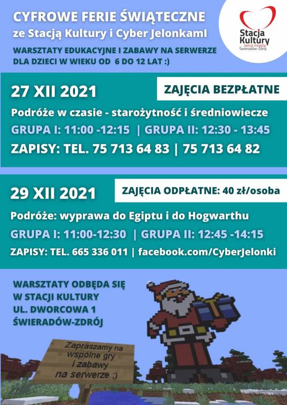 Uwaga, uwaga! Właśnie ruszyły zapisy na warsztaty edukacyjne i zabawy na serwerze w ramach Cyfrowych Ferii Świątecznych – organizowanych przez nas we współpracy z Cyberjelonki . Zajęcia skierowane są do Dzieci w wieku 6-12 lat. Warsztaty 27.12.2021 są bezpłatne i zapisy na nie zbierane są w Stacji Kultury (tel. 75 713 64 82). Zajęcia 29.12.2021 są odpłatne (40 zł od osoby) i zapisy prowadzone są bezpośrednio przez Cyberjelonki pod numerem telefonu: 665 336 011. Zachęcamy do udziału!
