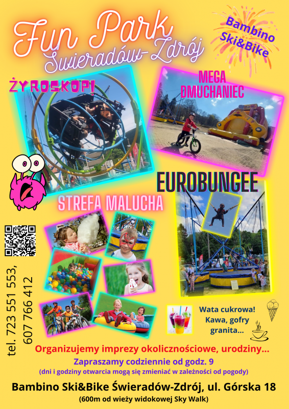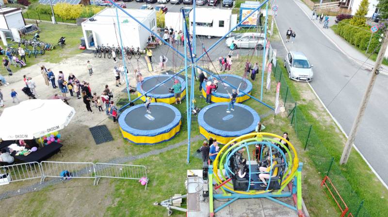 Dmuchańce, eurobungee, żyroskop (symulator lotniczy), pontony, strefa malucha, mała gastronimia (lody, wata cukrowa, granita, frytki, gofry, grill, napoje chłodzące :-) )