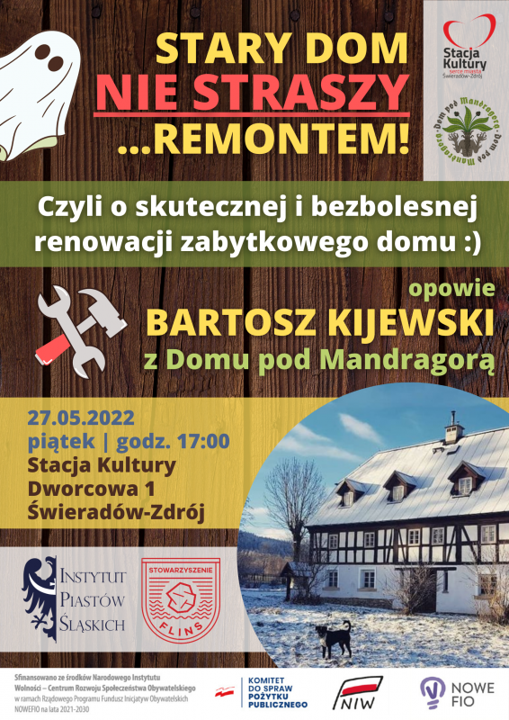 Serdecznie zapraszamy w piątek 27.05.2022 o godz. 17:00 na spotkanie z Bartoszem Kijewskim, w trakcie którego dowiemy się, jak wyremontować zabytkowy dom – na przykładzie Domu pod Mandragorą.