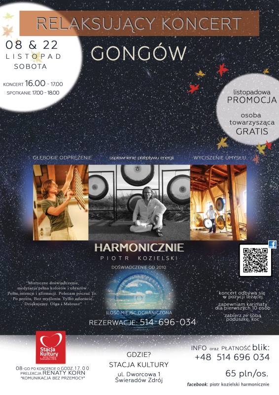 Zapraszamy na wyjątkowy koncert gongów w wykonaniu Piotra Kozielskiego – Harmonicznie, który od 2010 roku prowadzi dźwiękowe podróże w głąb siebie. Będzie to jeden z dwóch koncertów, które odbędą się w listopadzie - kolejny 22.11.2025 r.