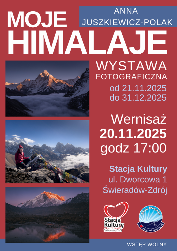 Zapraszamy na wernisaż wystawy fotograficznej Anny Juszkiewicz „Moje Himalaje” , który odbędzie się 20 listopada 2025 r. o godz. 17:00 w Stacji Kultury w Świeradowie-Zdroju.