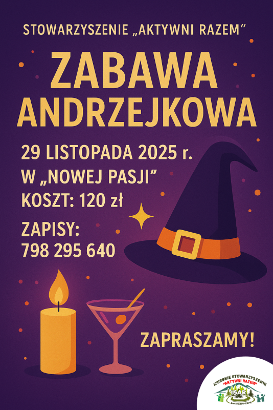 Zabawa Andrzejkowa odbędzie się 29 listopada 2025 r. w lokalu „Nowa Pasja”. To doskonała okazja, by spędzić wieczór pełen tańca, wróżb i dobrej zabawy!