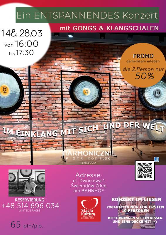 Stacja Kultury w Świeradowie-Zdroju zaprasza na niezwykłe wydarzenie, które pozwoli zatrzymać się na chwilę, wyciszyć myśli i odzyskać wewnętrzną równowagę. „Relaksujące wibracje gongów i mis” to wyjątkowa podróż w świat dźwięku, głębokiego relaksu i świadomego odpoczynku.