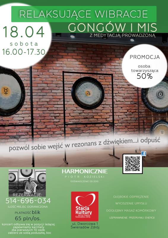 Już 18 kwietnia w Stacji Kultury zapraszamy na relaksujące wibracje gongów i mis połączone z medytacją prowadzoną. To wyjątkowe spotkanie, które pozwoli wejść w głęboki stan odprężenia, wyciszyć umysł i odzyskać równowagę.