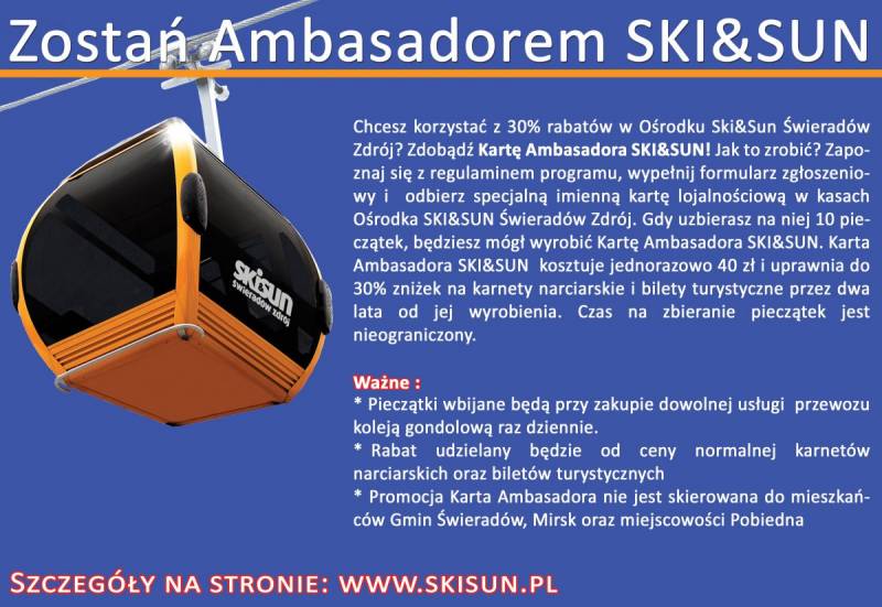 Szanowni Państwo, uprzejmie informujemy, iż mogą Państwo skorzystać z programu lojalnościowego „Karta Ambasadora SKI&SUN Świeradów Zdrój”.
