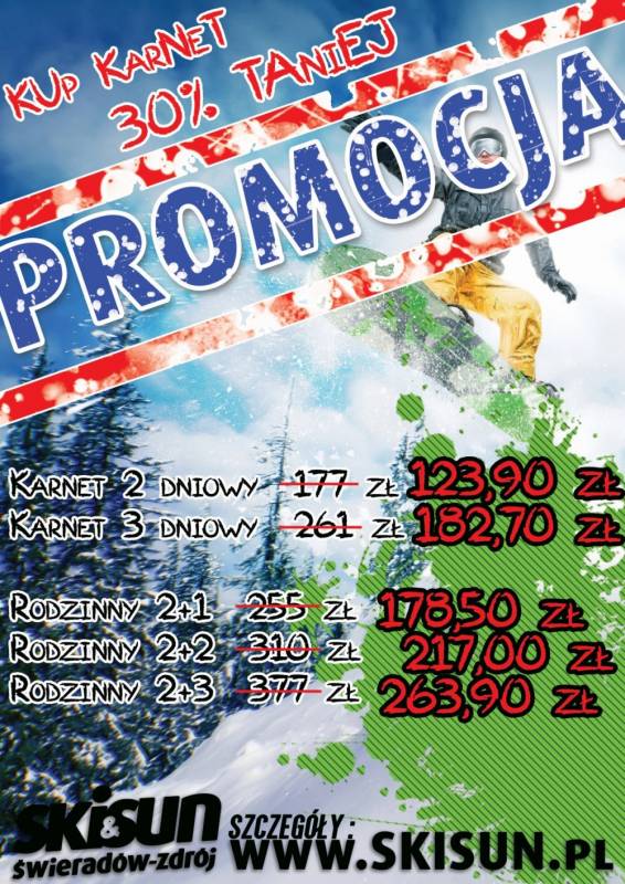 Ośrodek SKI&SUN Świeradów Zdrój zaprasza Państwa do zapoznania się z ofertą przedsprzedaży karnetów zimowych w Ośrodku SKI&SUN Świeradów Zdrój z 30% rabatem.