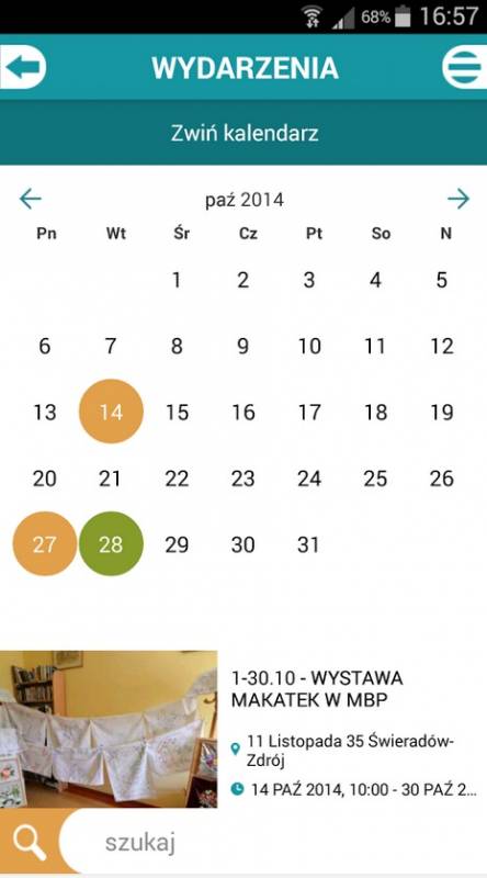 - Obszerny kalendarz imprez zawierający opisy i terminy wydarzeń, m.in.: koncertów, imprez sportowych i plenerowych, a także lokalizację miejsc, w których odbywają się imprezy wraz z wyznaczaniem trasy dojścia lub dojazdu, z wykorzystaniem systemu GPS.