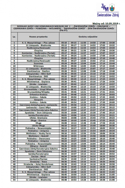 Rozkład jazdy - linia nr 1 Komunikacji Miejskiej Świeradów-Zdrój