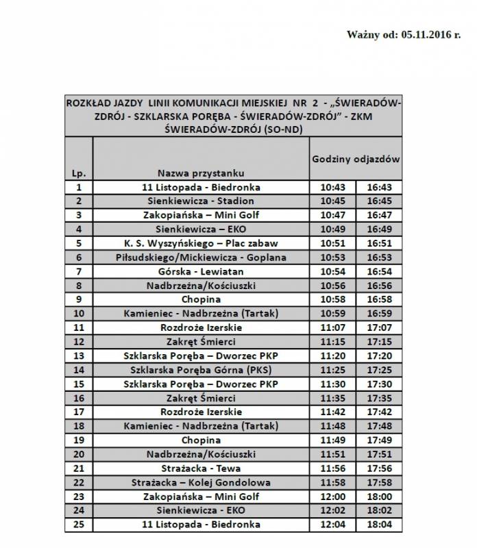 Rozkład jazdy - linia nr 2 Komunikacji Miejskiej Świeradów-Zdrój