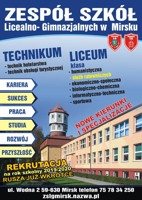 Od września 2019r. w technikum hotelarsko-turystycznym realizowany jest projekt „Podniesienie motywacji i rozwoju kompetencji dzieci i młodzieży w Mirsku”, dzięki czemu: wyposażyliśmy pracownię obsługi informatycznej w 11 laptopów, doposażyliśmy pracownie hotelarską i geograficzną w nowe tablice interaktywne. Wyposażyliśmy szkołę w narzędzia TIK - rozszerzyliśmy zasięg bezprzewodowego Internetu i poprawiliśmy parametry jego funkcjonowania. Uruchamiamy nowatorskie rozwiązanie chmurowe „ Documaster Campus” dzięki czemu uczniowie i nauczyciele mają możliwość korzystania z wirtualnej wymiany, obiegu dokumentów oraz z ksero i skanera na wielofunkcyjnym urządzeniu znajdującym się w bibliotece szkolnej. Nauczyciele i uczniowie ZSL-G w Mirsku korzystają z urządzenia bezpłatnie. Każdemu użytkownikowi nadany został indywidualny kod dostępu do urządzenia i wirtualnego konta. Wszyscy uczniowie i nauczyciele uczestniczyli w szkoleniu podnoszącym kompetencje cyfrowe w zakresie korzystania z mobilnego repozytorium i chmury edukacyjnej. Uczestnictwo w projekcie daje możliwość podnoszenia kompetencji i kwalifikacji zawodowych poprzez uczestnictwo w bezpłatnych kursach zawodowych czy szkoleniach z zakresu kompetencji społecznych . Od lutego br. 10-ciu uczniów technikum uczestniczy w 40 godzinnym kursie „Komunikacja społeczna w pozytywnym kreowaniu wizerunku”. Do końca kwietnia kurs zostanie zrealizowany również dla nauczycieli. Na początku marca rozpoczął się 20 godzinny kurs „Wykorzystanie MS Office 365 w praktyce”, którym objętych zostało 20 uczniów i nauczycieli. Ponadto w ramach projektu zaplanowano dla uczniów kursy kompetencji społecznych, kursy i zajęcia ICT: programy biurowe w administracji systemy prezentacji informacji w biznesie, grafika komputerowa, systemy mobilne w biznesie. Wszystkie kursy kończą się uzyskaniem zaświadczenia potwierdzającego nabycie nowych kompetencji czy kwalifikacji. Od września 2019r. uczniowie zostaną objęci: dodatkowymi zajęciami językowymi z angielskiego, niemieckiego, hiszpańskiego, francuskiego i rosyjskiego; zajęciami rozwijającymi uzdolnienia z matematyki i geografii; zajęciami wyrównawczymi z matematyki; zajęciami z doradztwa edukacyjno- zawodowego .