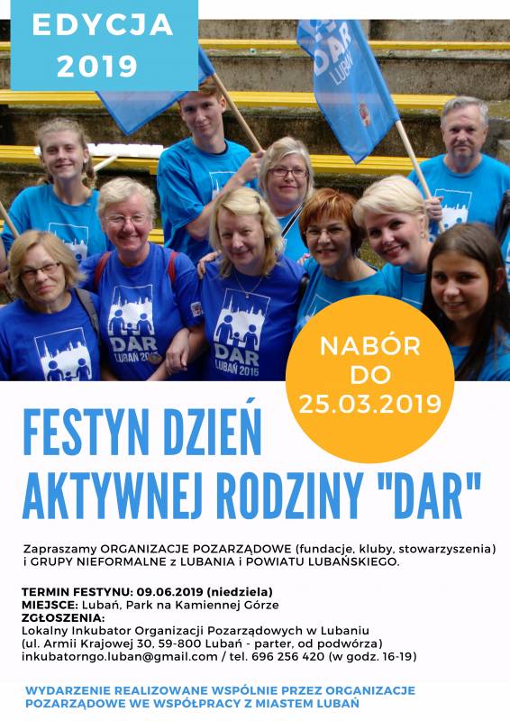 DAR to rodzinny festyn, organizowany przez lokalne stowarzyszenia, fundacje, kluby i grupy nieformalne (z Lubania i powiatu lubańskiego) wraz Miastem Lubań. Z roku na rok przyciąga dobrą zabawą coraz więcej mieszkańców Lubania i regionu, będąc świetną okazją do aktywnego spędzenia czasu przez całe rodziny i spotkania z pasjonatami. W marcu pełną parą ruszają przygotowania do tegorocznej edycji festynu, koordynowanego przez Stowarzyszenie Południowo-Zachodnie Forum Samorządu Terytorialnego „Pogranicze” i Łużyckie Centrum Rozwoju w Lubaniu.