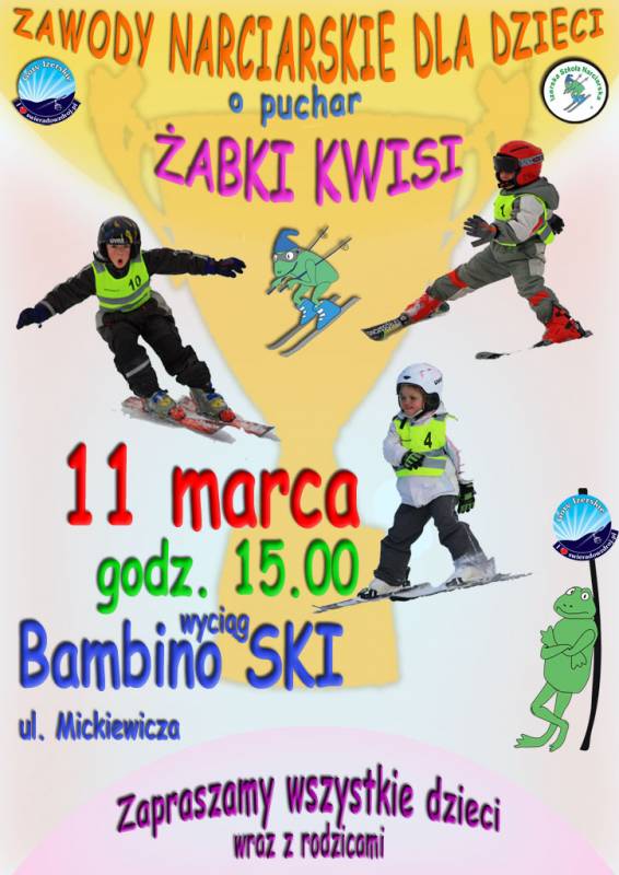 Dnia 11 marca o godz. 15.00 na wyciągu narciarskim Bambino SKI odbędą się zawody narciarskie dla dzieci o Puchar Żabki Kwisi pod patronatem Burmistrza Miasta Świeradów-Zdrój. Zapraszamy do uczestnictwa wszystkie dzieci. Zapraszamy także rodziców.