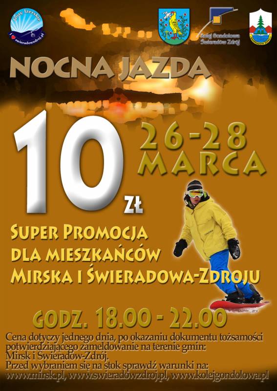 W dniach 26-28.03.2010 w godzinach 18.00 - 22.00 (nocne jazdy) Gminy Mirsk i Świeradów-Zdrój zapraszają naszych mieszkańców na zimowe szaleństwo za jedyne 10 zł dziennie.