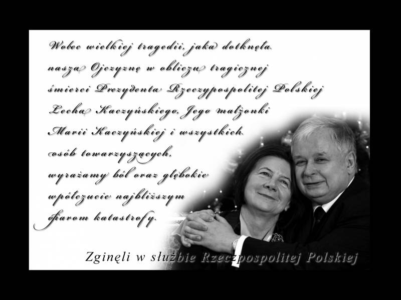 Wobec wielkiej tragedii, jaka dotknęła nasza Ojczyznę w obliczu tragicznej śmierci Prezydenta Rzeczypospolitej Polskiej Lecha Kaczyńskiego, Jego małzonki Marii Kaczyńskiej i wszystkich osób towarzyszących wyrażamy ból oraz głębokie wpółczycie najbliższym ofiarom katastrofy.