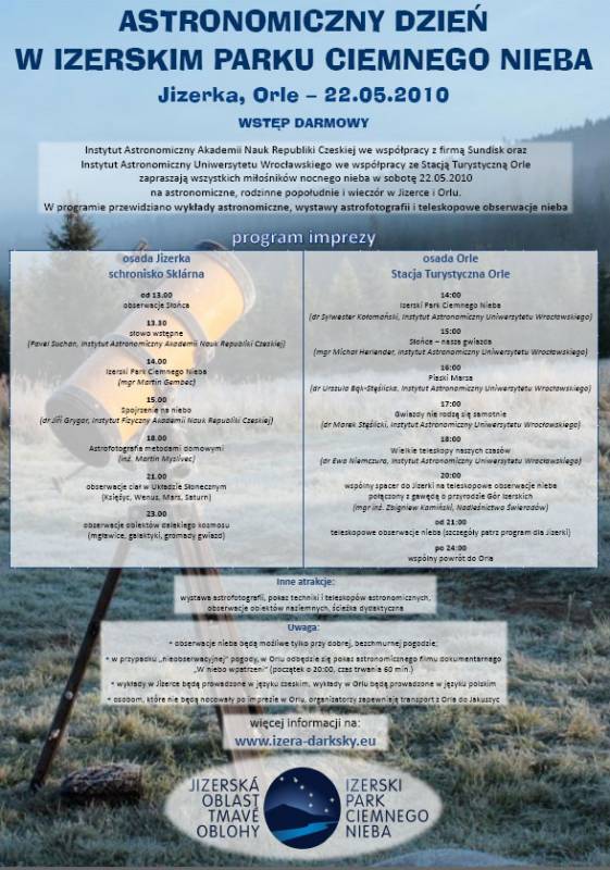 Instytut Astronomiczny Akademii Nauk Republiki Czeskiej we współpracy z firmą Sundiskoraz Instytut Astronomiczny Uniwersytetu Wrocławskiego we współpracy ze Stacją Turystyczną Orle zapraszają wszystkich miłośników nocnego nieba w sobotę 22.05.2010 na astronomiczne, rodzinne popołudnie i wieczór w Jizercei Orlu.
