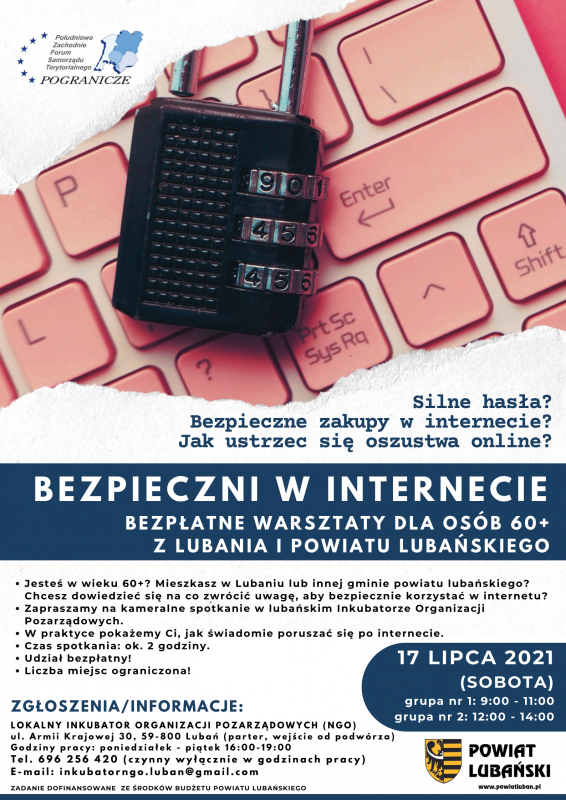 Stowarzyszenie P-ZFST „Pogranicze” zaprasza mieszkańców Lubania i powiatu lubańskiego w wieku 60+ do Lokalnego Inkubatora Organizacji Pozarządowych (NGO) w Lubaniu na bezpłatne warsztaty nt. bezpieczeństwa w internecie. Najbliższe spotkania już w sobotę 17 lipca 2021.