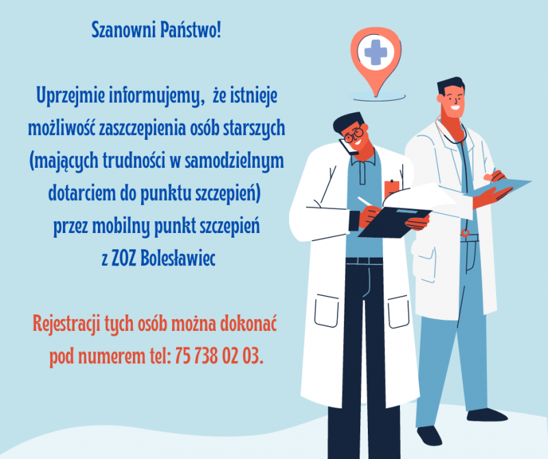 Uprzejmie informujemy, że istnieje możliwość zaszczepienia osób starszych (mających trudności w samodzielnym dotarciem do punktu szczepień)