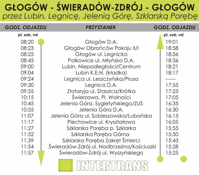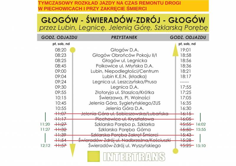 Szanowni Państwo, uprzejmie informujemy, że od dnia 01.07.2022 r. firma Intertrans PKS Sp. z o.o. wznowiła połączenia relacji Głogów - Świeradów-Zdrój. W związku z prowadzonymi pracami remontowymi na infrastrukturze drogowej w Szklarskiej Porębie wprowadzony został tymczasowy rozkład jazdy, który załączamy poniżej.