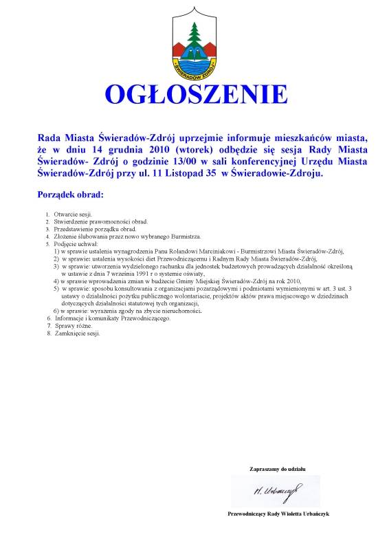 Rada Miasta Świeradów-Zdrój uprzejmie informuje mieszkańców miasta, że w dniu 14 grudnia 2010 (wtorek) odbędzie się sesja Rady Miasta Świeradów- Zdrój o godzinie 13/00 w sali konferencyjnej Urzędu Miasta Świeradów-Zdrój przy ul. 11 Listopad 35 w Świeradowie-Zdroju.
