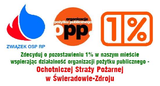W imieniu Zarząd oraz wszystkich członków Ochotniczej Straży Pożarnej w Świeradowie-Zdroju zwracam się z prośbą o wsparcie działalności naszego stowarzyszenia poprzez przekazanie 1% podatku należnego budżetowi państwa. Składając roczne zeznanie podatkowe o wysokości dochodów należy wpisać: