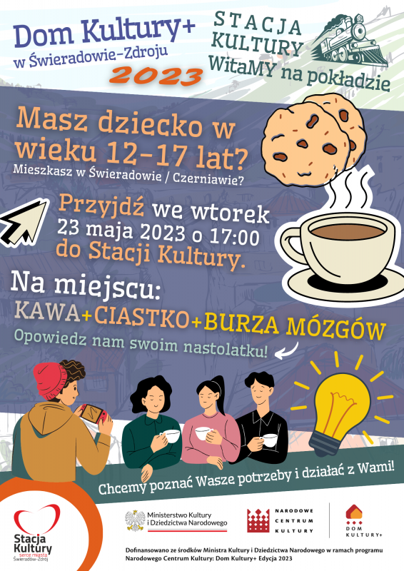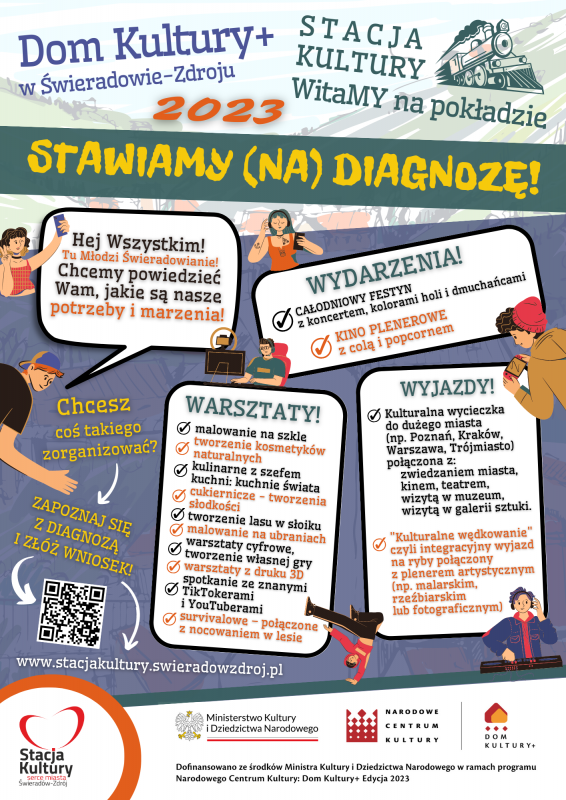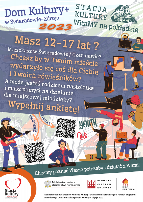 Kierując się ideą wzmacniania swojej pozycji poprzez bycie bliżej mieszkańców, Stacja Kultury zdecydowała się wziąć udział w programie Narodowego Centrum Kultury: Dom Kultury+ Edycja 2023. W pierwszej części projektu „Stacja Kultury – witaMY na pokładzie” przeprowadzamy diagnozę lokalnego potencjału kulturotwórczego. Badaniami objęliśmy młodzież w wieku 12-17 lat – grupę najmniej uczestniczącą w dotychczasowych działaniach centrum. Za pomocą ankiet, spotkań warsztatowych i rozmów, chcemy zidentyfikować konkretne potrzeby i oczekiwania młodych mieszkańców i mieszkanek. Opracowanie diagnozy z badań pozwoli m.in. centrum zaplanować kalendarz wydarzeń dla młodzieży na najbliższy czas, unikając chybionych i niedopasowanych pomysłów. Dzięki realizacji projektu chcemy, aby Stacja Kultury zaczęła w świadomości lokalnej społeczności istnieć nie tylko jako budynek, a bardziej jako jeden z elementów życia świeradowskiej młodzieży.