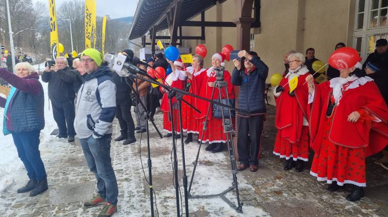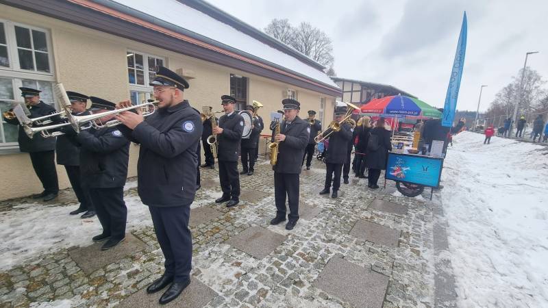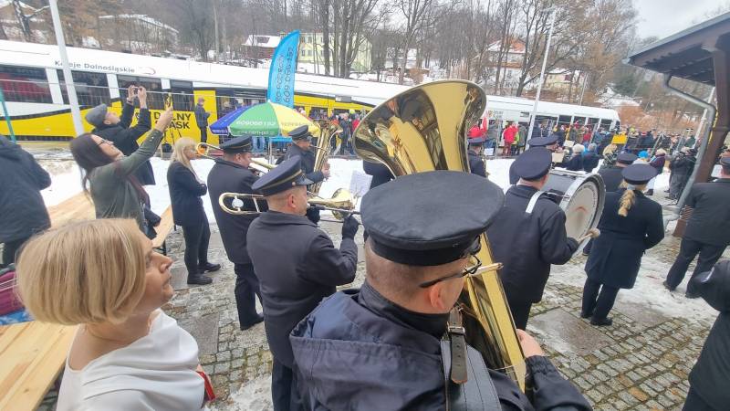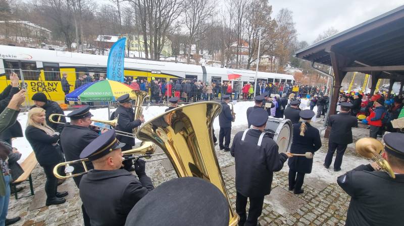 Pierwszy pociąg, który 7.12.2023 wjechał na świeradowski dworzec, powitaliśmy hucznie i tłumnie, machając proporczykami Kolei Dolnośląskich – przy akompaniamencie orkiestry dętej z Turowa. Radość była przeogromna! Nie zabrakło również łez wzruszenia.
