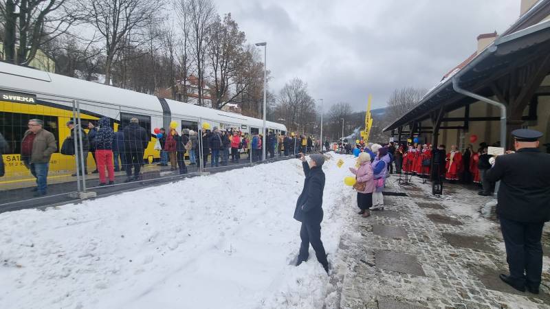 Wiele osób skorzystało tego dnia z darmowych przejazdów koleją na trasie Świeradów-Zdrój – Mirsk – Gryfów Śląski, inaugurując w ten sposób nowy szlak komunikacyjny do naszego uzdrowiska. Przypominam, że już od niedzieli 10.12.2023 linia obsługiwana jest w ramach regularnych połączeń i można z niej śmiało korzystać.