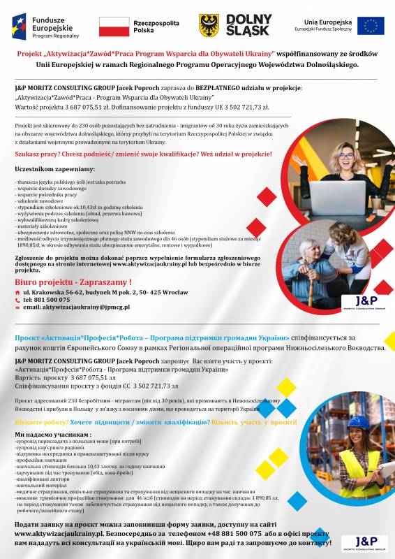 Trwa rekrutacji osób powyżej 30 r.ż. pozostających bez zatrudnienia, zamieszkujących woj. Dolnośląskie, które przybyły na terytorium Rzeczpospolitej Polskiej w związku z działaniami wojennymi prowadzonymi na terenie Ukrainy do bezpłatnego udziału w projekcie aktywizacji zawodowej pt." Aktywizacja*Zawód*Praca - Program Wsparcia dla Obywateli Ukrainy ", nr   RPDS.08.02.00-02-0004/22 dofinansowanego z Europejskiego Funduszu Społecznego.