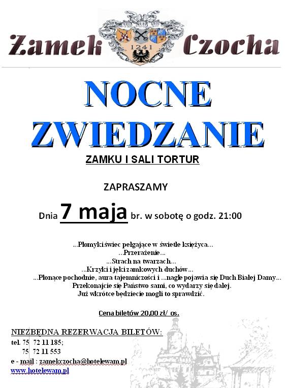 Zapraszamy serdecznie mieszkańców Świeradowa-Zdroju i okolic oraz turystów przebywających na naszym terenie na niecodzienne wydarzenie, jakie odbędzie się w dniu 7 maja 2011r. w Zamku Czocha. Będzie to Nocne zwiedzanie Zamku z duchami i Białą Damą.