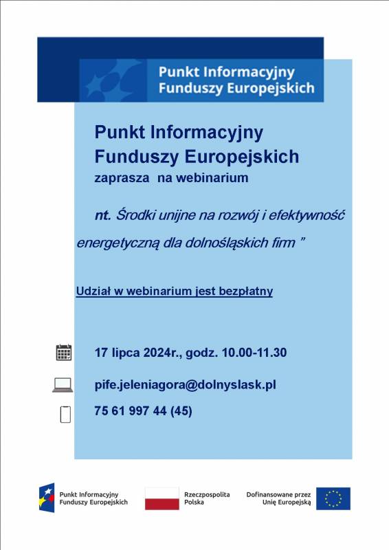 Urząd Marszałkowski Województwa Dolnośląskiego we Wrocławiu – Punkt Informacyjny Funduszy Europejskich w Jeleniej Górze zaprasza na webinarium pt. „Środki unijne na rozwój i efektywność energetyczną dla dolnośląskich firm”.