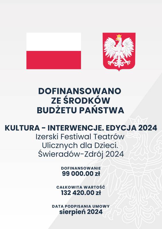 Realizacja tego wspaniałego wydarzenia jest możliwa dzięki temu, że Stacja Kultury w Świeradowie-Zdroju jako jedna z nielicznych w Polsce (bo spośród ponad 2 tysięcy wnioskodawców) pozyskała dofinansowanie w kwocie aż 99 tysięcy złotych z Ministerstwa Kultury i Dziedzictwa Narodowego oraz Narodowego Centrum Kultury w programie "Kultura – Interwencje 2024". Wniosek do Ministerstwa napisała i złożyła dla nas Beata Rosicka.