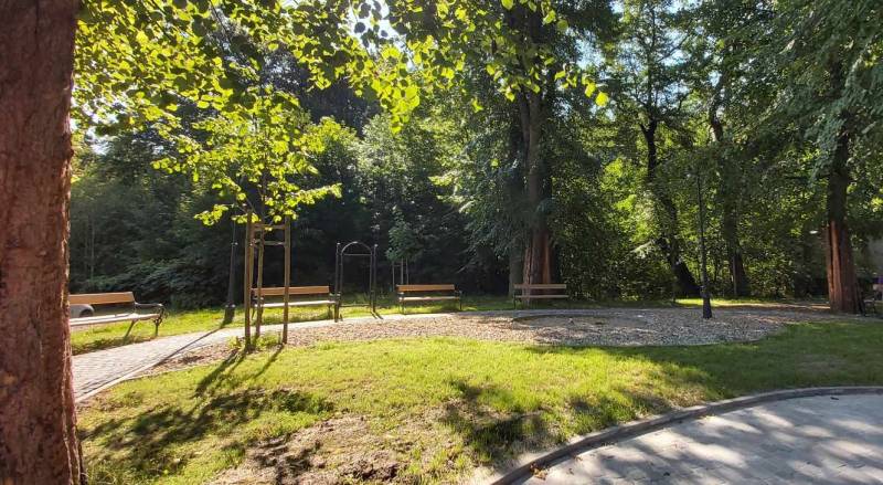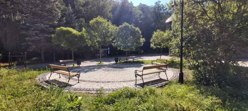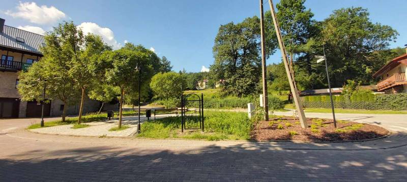 • Utwardzony plac na skrzyżowaniu ulic Sanatoryjnej i Izerskiej - utwardzenie nawierzchni w formie okrągłego placu z nawierzchnią z kostki betonowej kolor srebrno-szary stylizowanej na kostkę brukową oraz z kostki granitowej szarej ,wzór w łuskę; montaż elementów małej architektury, zewnętrzna instalacja oświetleniowa z latarniami wys. 4m.