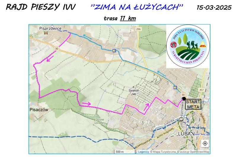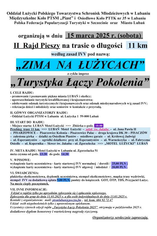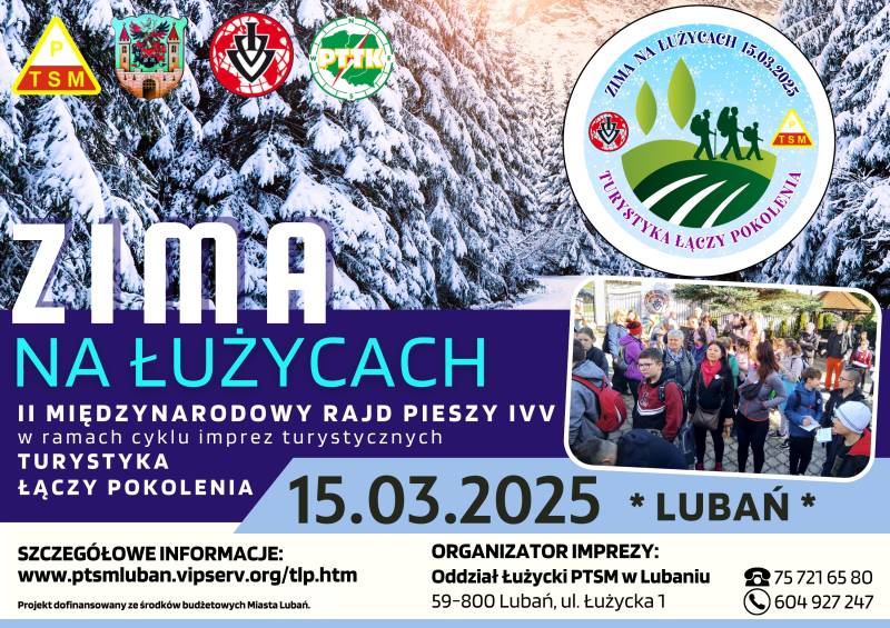 Miasto Lubań organizują w dniu 15 marca 2025 r. (sobota) II Rajd Pieszy na trasie o długości 11 km według zasad IVV pod nazwą:„ZIMA NA ŁUŻYCACH” z cyklu imprez „Turystyka Łączy Pokolenia”.