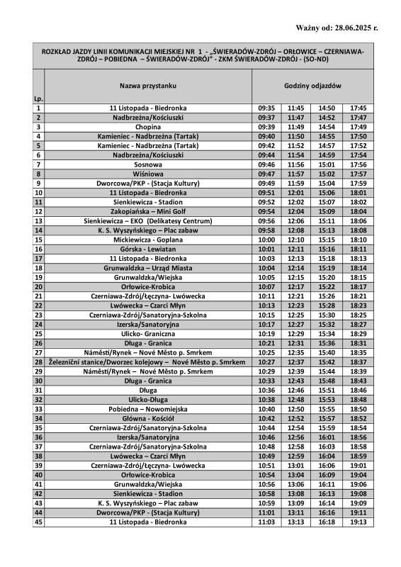 rozkład jazdy komunikacji miejskiej dla linii nr 1. Kurs do Nove Mesto p. Smrkem rozpocznie się od