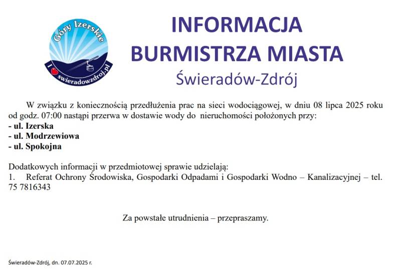 W związku z koniecznością przedłużenia prac na sieci wodociągowej, w dniu 08 lipca 2025 roku od godz. 07:00 nastąpi przerwa w dostawie wody do nieruchomości położonych przy: