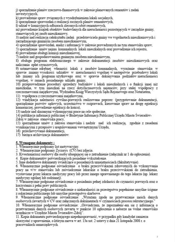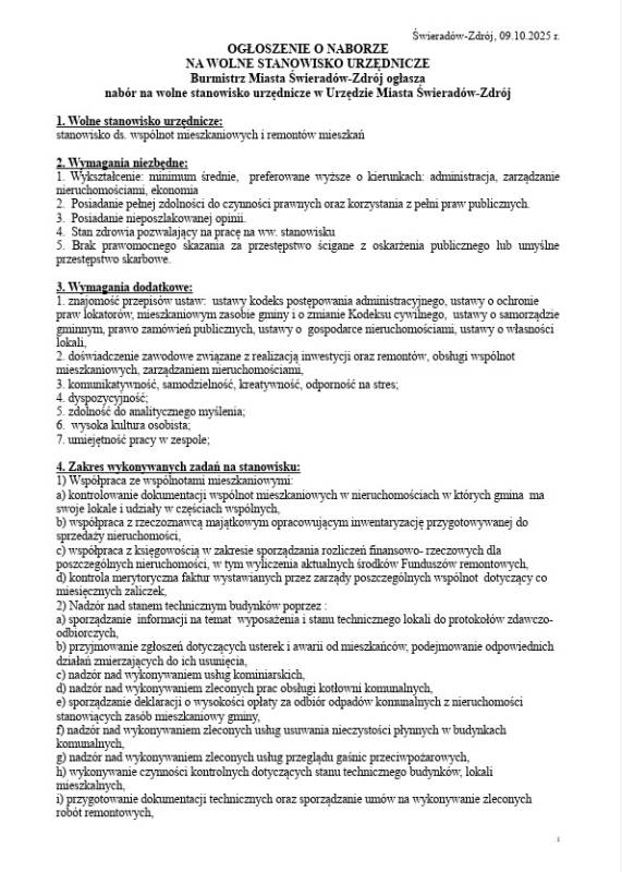 Burmistrz Miasta Świeradów-Zdrój ogłasza nabór na wolne stanowisko urzędnicze w Urzędzie Miasta Świeradów-Zdrój na stanowisko ds. wspólnot mieszkaniowych i remontów mieszkań.