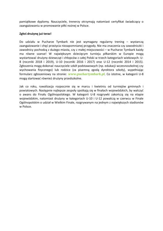 od listopada nauczyciele szkół podstawowych i przedszkoli oraz rodzice mogą zgłaszać drużyny do udziału w największych rozgrywkach piłkarskich dla dzieci w Europie – Pucharze Tymbark. Spotkanie z reprezentantami Polski, gra na największych stadionach oraz możliwość pokazania swojego talentu skautom PZPN – to wszystko czeka na finalistów XXVI edycji turnieju. Więcej informacji przesyłamy w załączeniu wraz z komentarzami Jana Urbana, selekcjonera reprezentacji Polski mężczyzn, Dominiki Grabowskiej, reprezentantki Polski oraz Krzysztofa Pawińskiego, prezesa Grupy Maspex.
