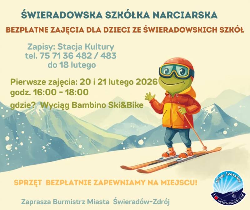 Edyta Wilczacka Burmistrz Miasta Świeradów-Zdrój zaprasza dzieci do udziału w Świeradowskiej Szkółce Narciarskiej.