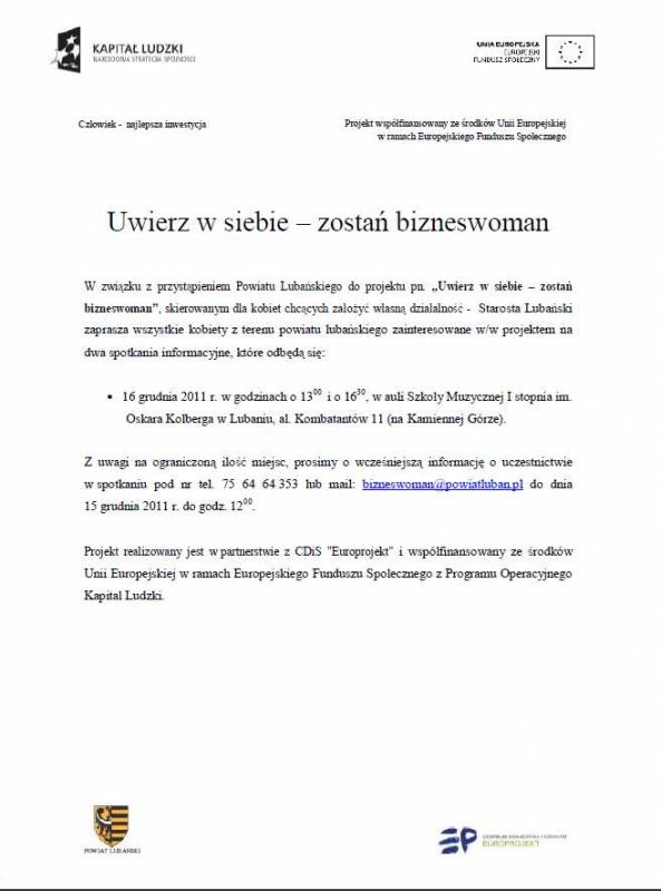 W związku z przystąpieniem Powiatu Lubańskiego do projektu pn. „Uwierz w siebie – zostań bizneswoman”, skierowanym dla kobiet chcących założyć własną działalność - Starosta Lubański zaprasza wszystkie kobiety z terenu powiatu lubańskiego zainteresowane w/w projektem na dwa spotkania informacyjne, które odbędą się: