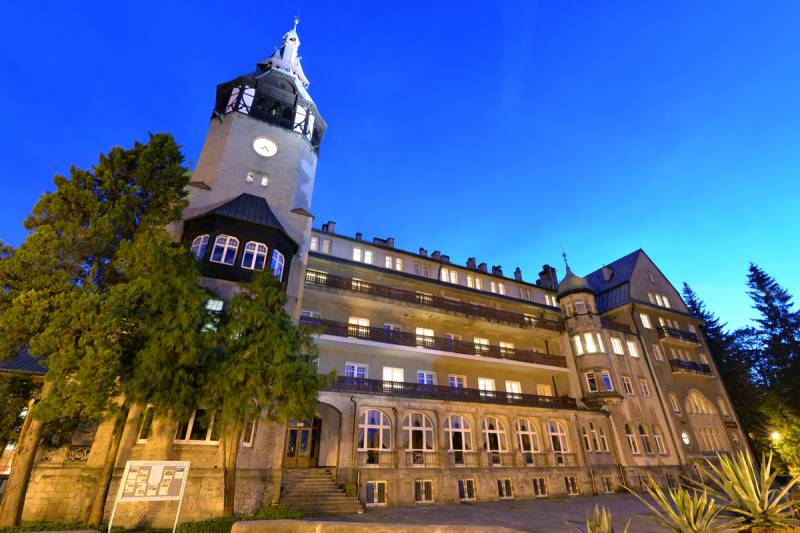 Nachází se na jihovýchodním úpatí Stogu Izerského. Byl postaven v místě původního „Pramenního domu” („Dom Źródlany”) z roku 1781, který byl zničen v požáru 14. prosince 1895. Lázeňský dům byl znovu rychle postaven rodinou Schaffgotschů, a to na základě projektu vratislavského architekta Grossera. V roce 1899 byli v domě přijímáni první lázeňští hosté. Malebnost stavby zdůrazňuje hodinová věž vysoká 46 metrů. Atraktivitu budovy dotváří nejdelší modřínová Vycházková hala (Hala Spacerowa) v Dolním Slezsku dlouhá 80 metrů, která je nyní jednou z nejvýznamnějších zajímavostí Świeradowa-Zdroje. Nalézá se v ní krásná rostlinná polychromie, vitráž a erb rodiny von Schaffgotschů nad pódiem. U hlavního vchodu do Vycházkové haly je pramen pitné vody (radonovo-železité kyselky). Lázeňské terasy dlouhé na 160 metrů včetně koncertní mušle (rozebraná) a umělé jeskyně s krápníky, tenisové kurty a parky kdysi ve městě vytvářely neopakovatelnou atmosféru k rekreaci a odpočinku.