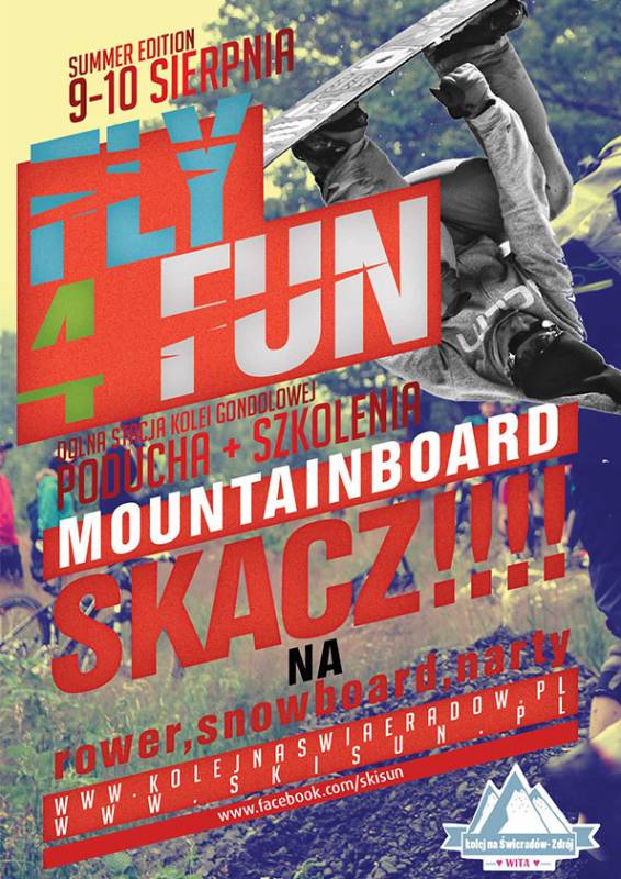 9 oraz 10 sierpnia Ośrodek SKI&SUN Świeradów Zdrój wspólnie ze stowarzyszeniem Kolej na Świeradów Zdrój zapraszają na letnią edycję imprezy FLY4FUN. Przez cały weekend na dolnej stacji kolei gondolowej będzie można podziwiać jak również uczestniczyć w skokach na rowerach, mountainboardach, nartach i snowboardach na wielką dmuchaną poduchę. Dodatkowo każdy chętny będzie mógł spróbować własnych sił w jeździe na desce MountainBoard bezpłatnie. Zapewniamy dużo emocji, zabawy i niesamowitych widoków.
